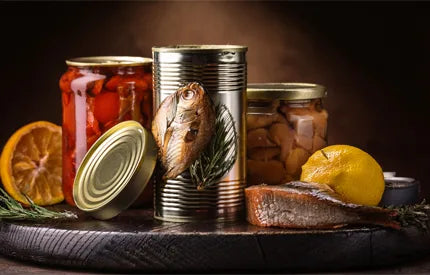 Metal-canned meats, fish, seafood, vegetables, legumes, fruits, and prepared meals (e.g., soups, porridges).
