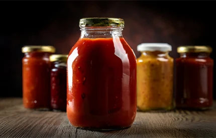 Bottled or canned sauces, jams, ketchup, and high-viscosity nutritional supplements.