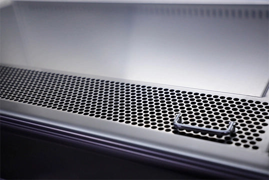 Inward airflow: Air is drawn into the cabinet through a perforated front panel and is then exhausted through a ULPA filter.