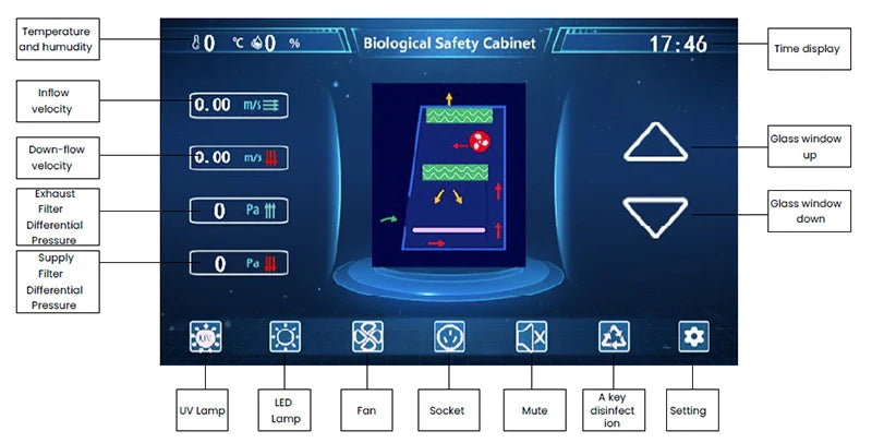 Intelligent control system: Operators can check detailed status of the cabinet, such as inflow and downflow velocity, work area temperature and humidity, filter pressure, UV working time and filter working time, filter life indicator etc.