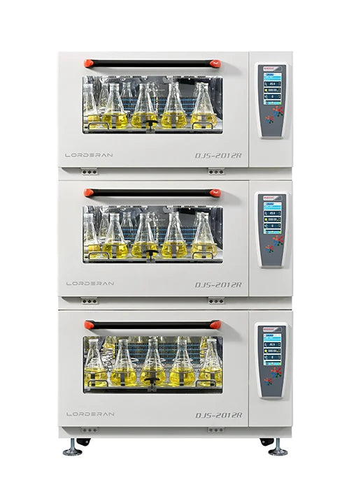 Agitateur empilable Lorderan avec fonction d'incubation et de réfrigération, trois fois la capacité d'un agitateur sur pied dans un encombrement pratiquement identique.